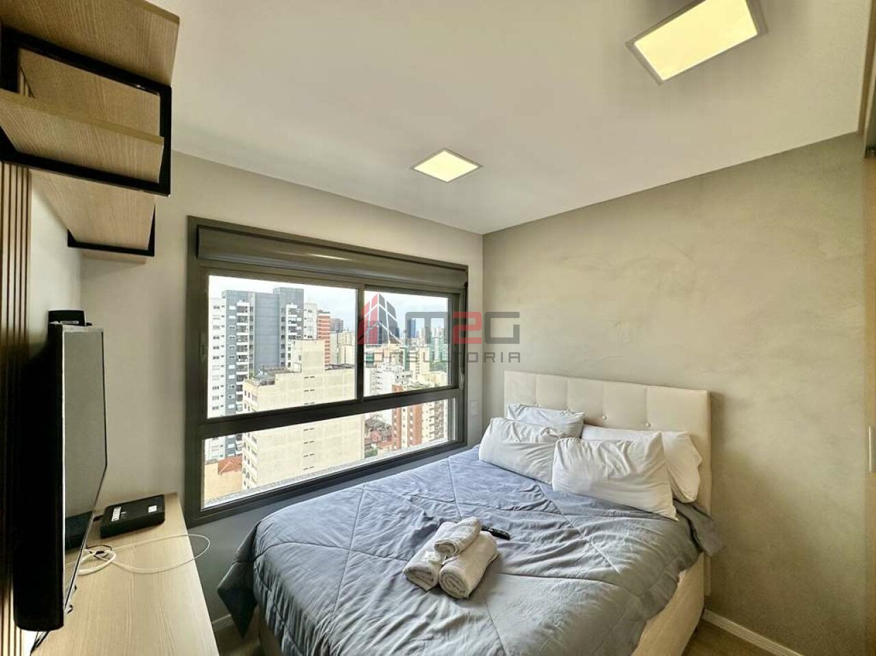 cama box, cabeceira c/ tomada USB, escrivaninha, guarda-roupas c/ 2 portas e TV LED 48".