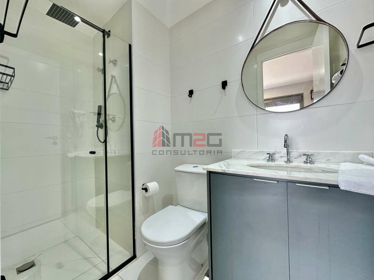 Banheiro com box de vidro, espelho e gabinete sob a pia.