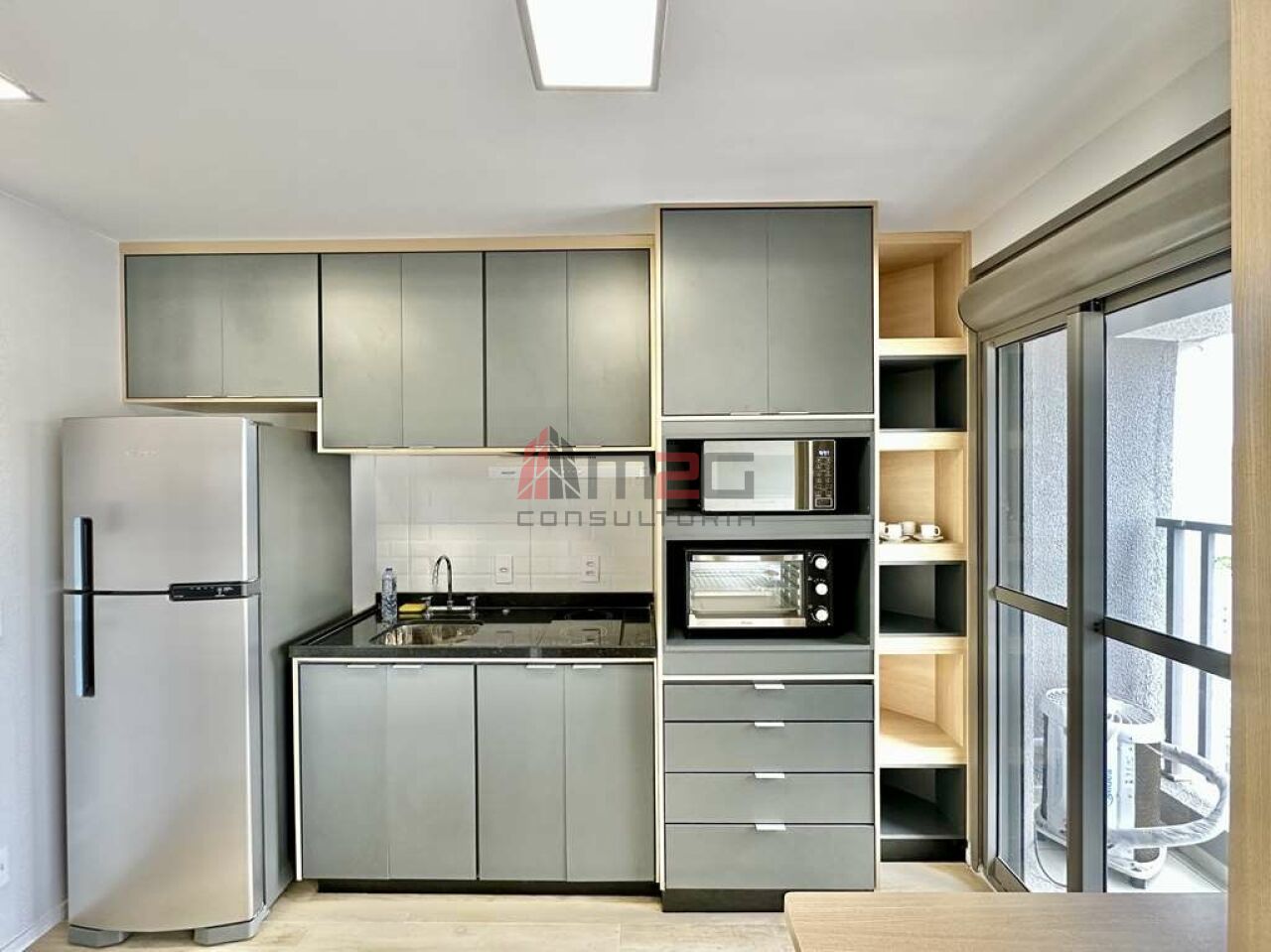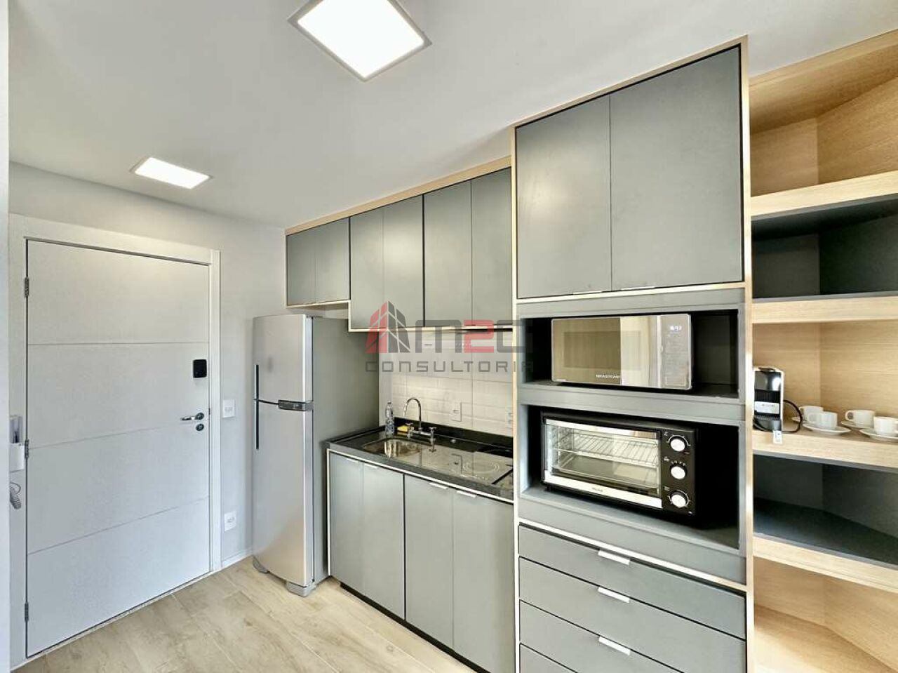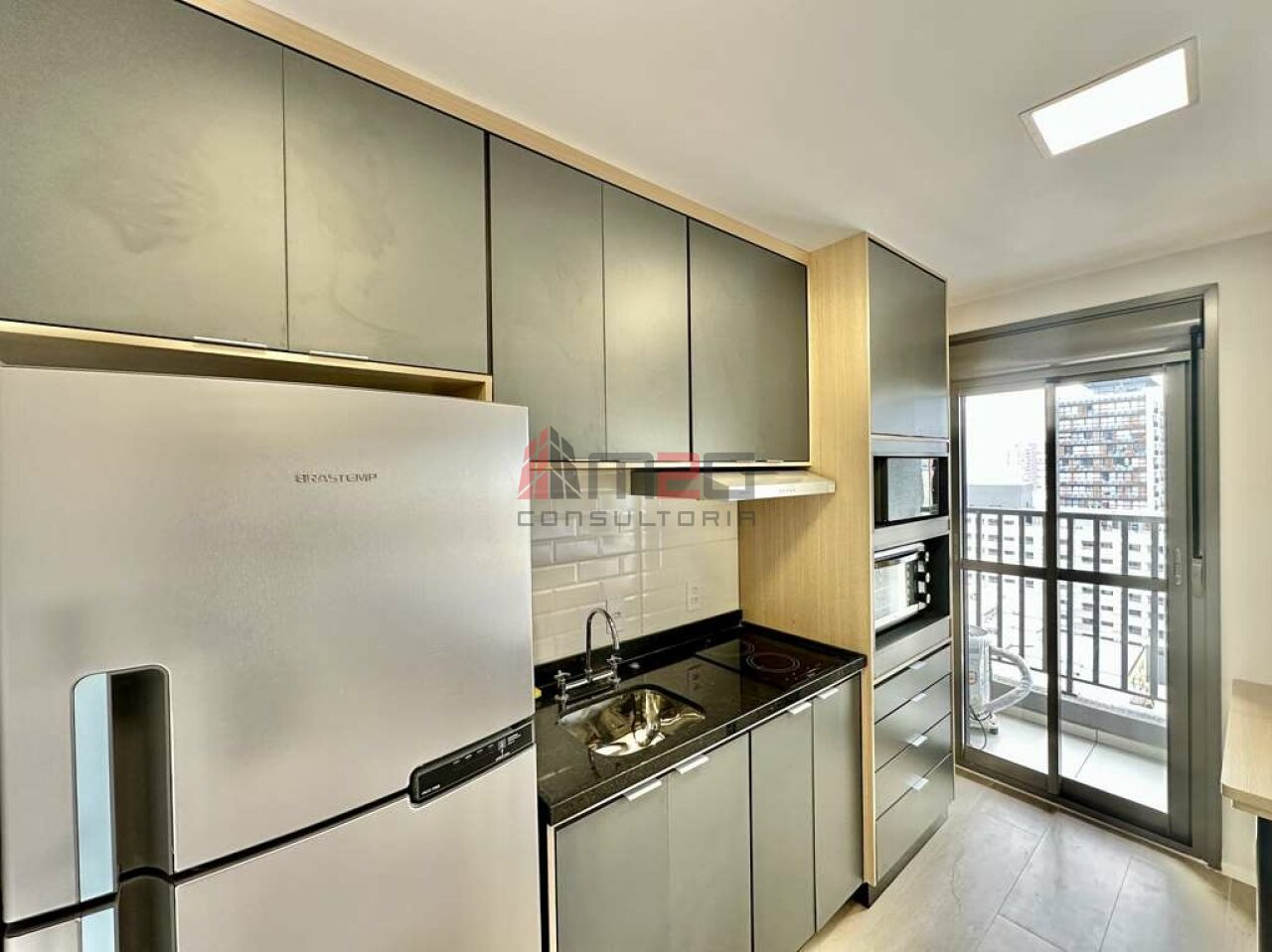Cozinha equipada com fogão de indução, depurador, forno elétrico, micro-ondas, geladeira.