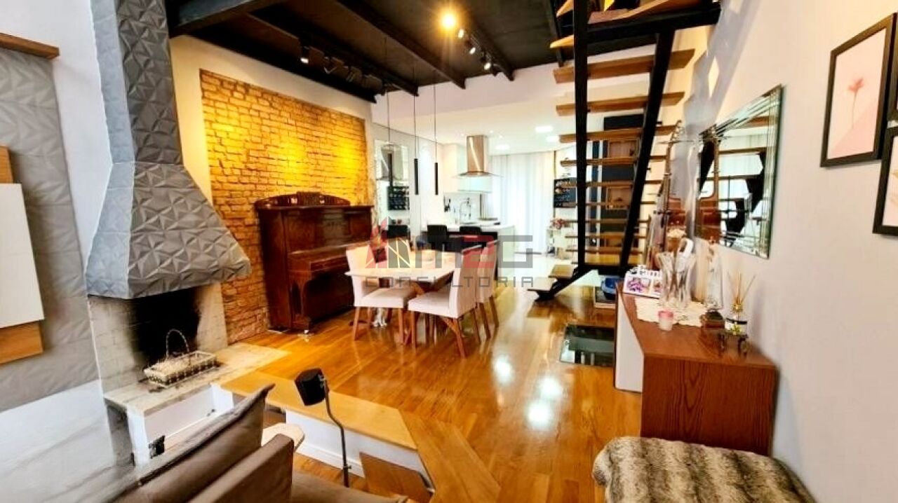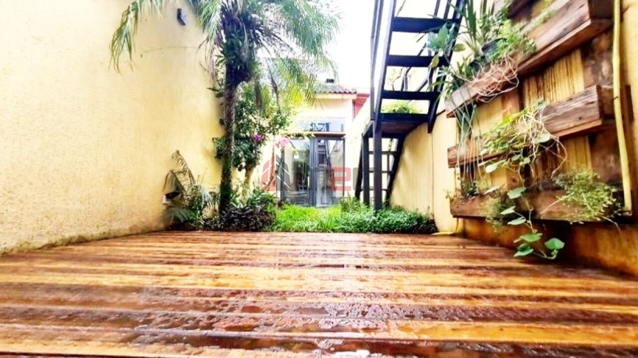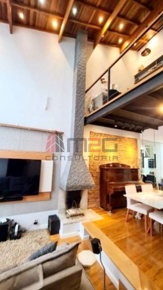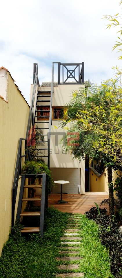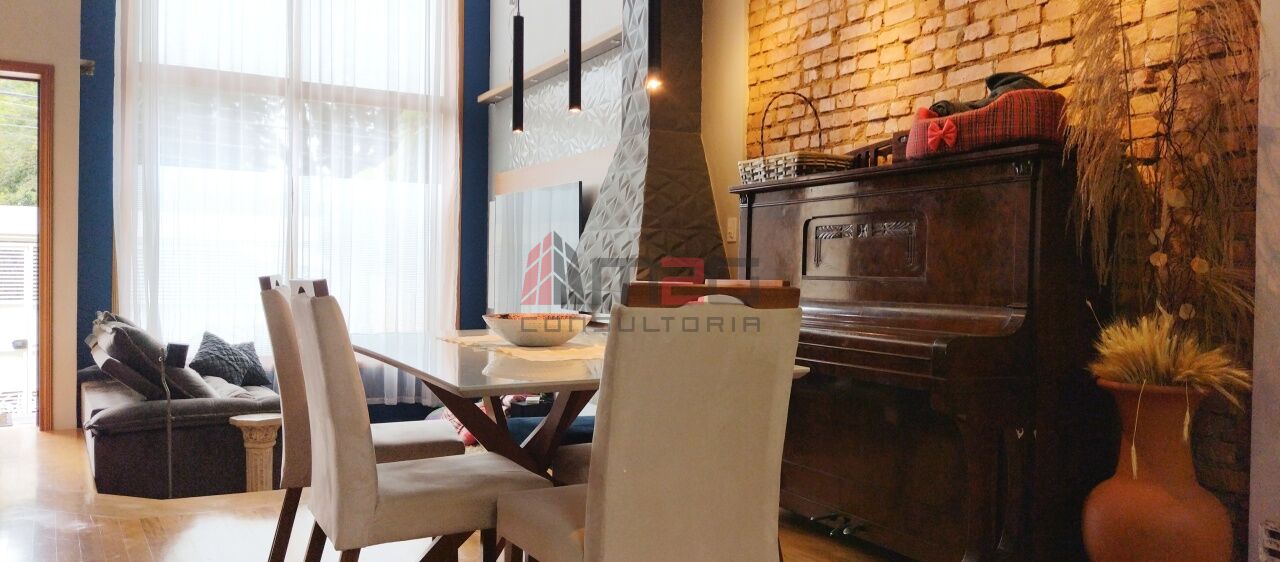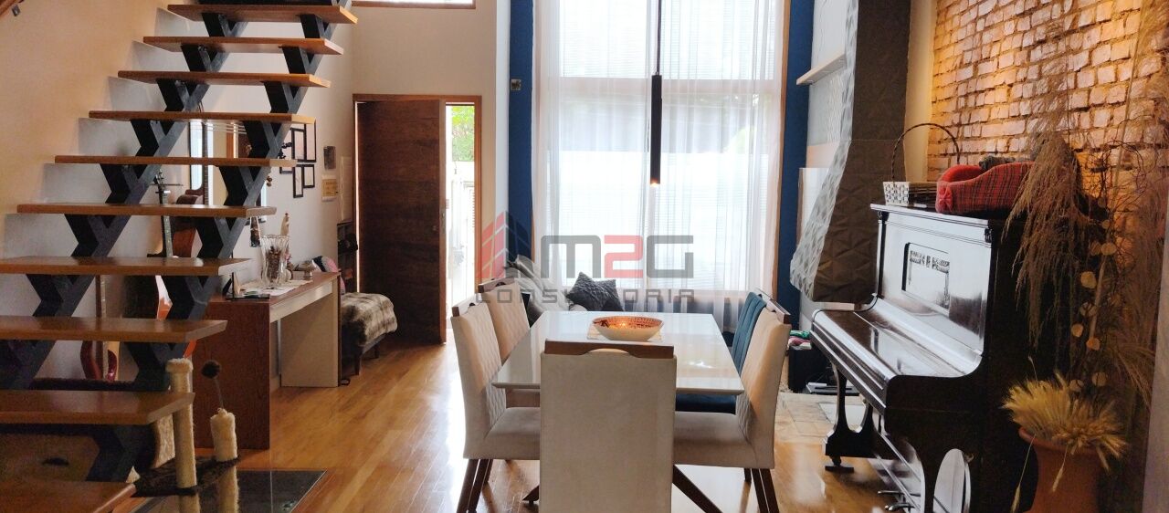 Sobrado moderno com 150m² AC, 148m² de terreno, 2 vagas - 3 dormitórios sendo: 1 suíte máster com closet e varanda, 1 suíte simples, 1 suíte de hospedes na edícula, 1 dormitório - Lavabo/WC social - Sala de estar com pé direito duplo - Sala de jantar - Lareira - Adega subterrânea com 2,5m² - Cozinha integrada com sala - Lavanderia - Jardim - Mezanino com escritório - Terraço gourmet com churrasqueira na parte superior da casa.