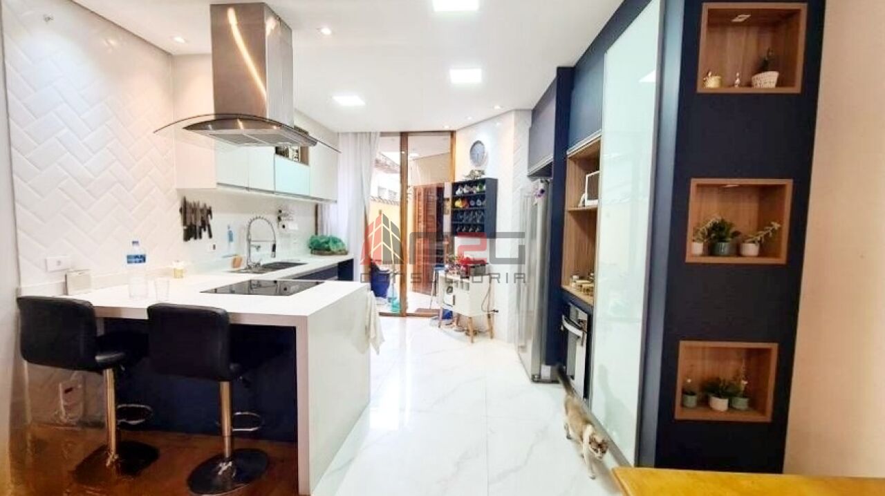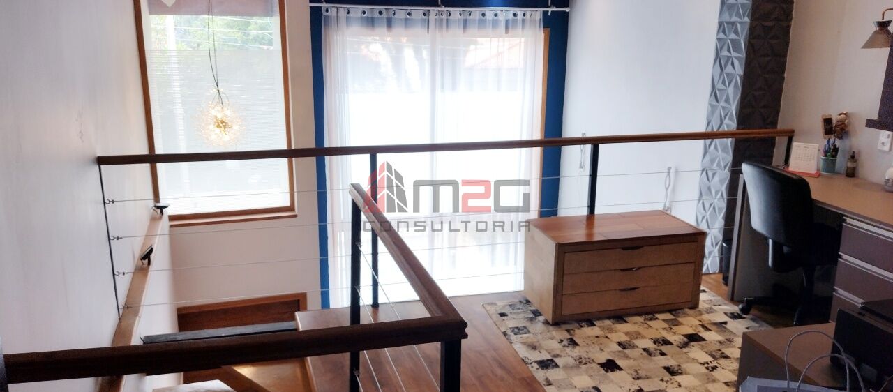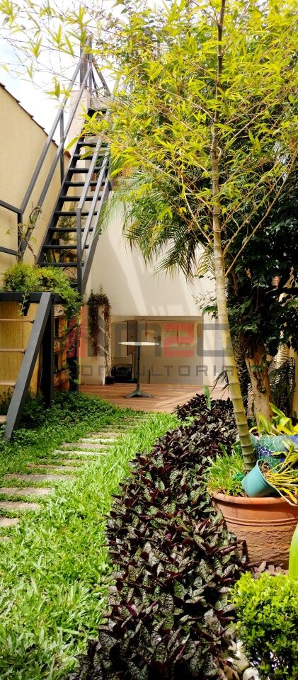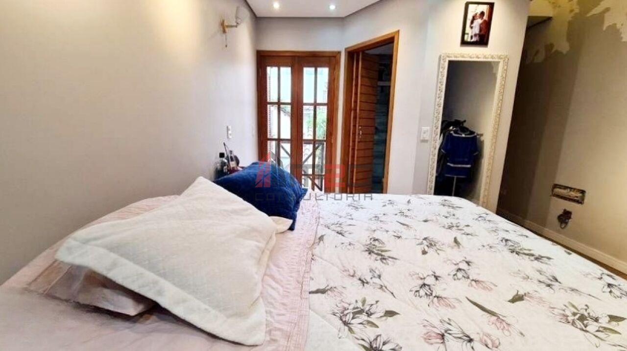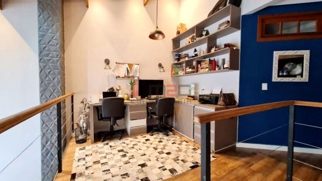 Sobrado moderno com 150m² AC, 148m² de terreno, 2 vagas - 3 dormitórios sendo: 1 suíte máster com closet e varanda, 1 suíte simples, 1 suíte de hospedes na edícula, 1 dormitório - Lavabo/WC social - Sala de estar com pé direito duplo - Sala de jantar - Lareira - Adega subterrânea com 2,5m² - Cozinha integrada com sala - Lavanderia - Jardim - Mezanino com escritório - Terraço gourmet com churrasqueira na parte superior da casa.